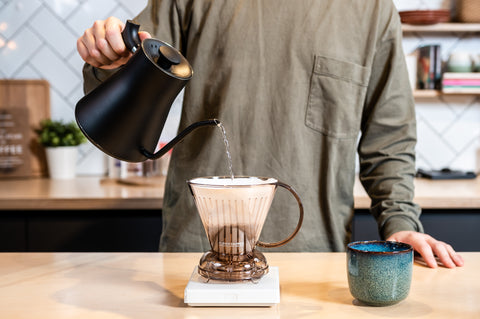 7. Put the dripper on top of your decanter or cup to release the valve, the coffee will start to drip through